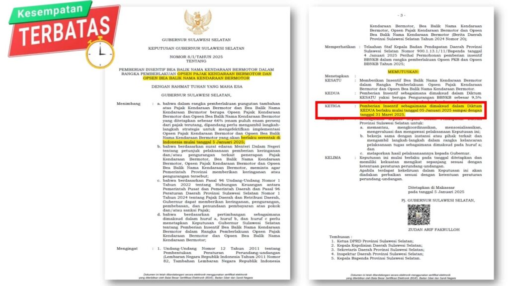 Pemerintah Provinsi Sulawesi Selatan melalui Bapenda atau Badan Pendapatan Daerah telah menurunkan Bea Balik Nama Kendaraan Bermotor (BBNKB) sebesar 9,5% terhadap kendaraan baru. Kebijakan ini dilakukan karena minat masyarakat yang tinggi untuk membeli kendaraan roda empat baru.