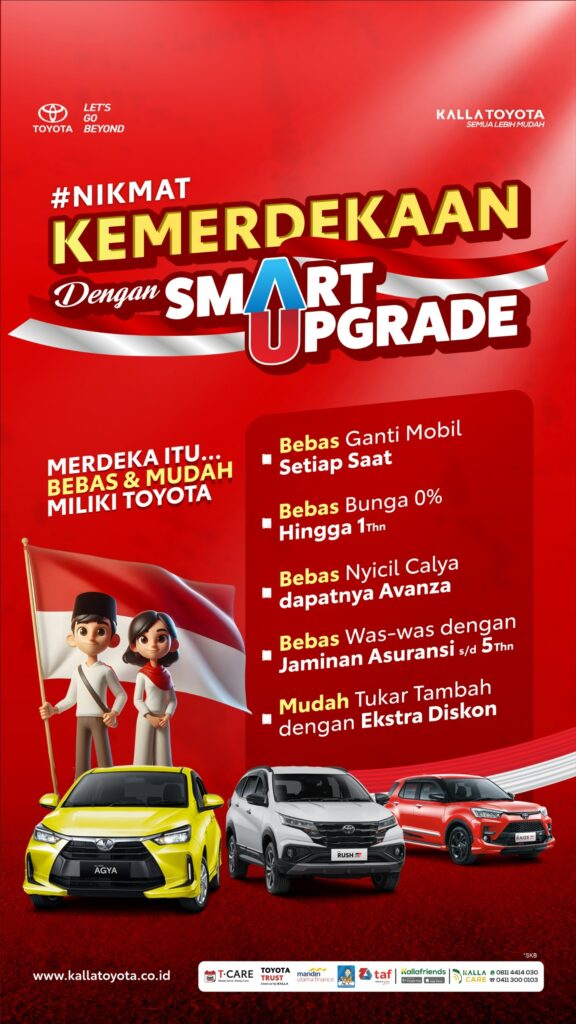 Toyota selalu dikenal dengan kualitasnya yang unggul dan harga yang terjangkau. Dalam Promo Kemerdekaan Toyota ini, Anda bisa mendapatkan mobil berkualitas dengan harga yang lebih ringan. Ini adalah kesempatan untuk merasakan performa dan kenyamanan berkendara dengan Toyota tanpa harus mengeluarkan biaya yang besar.